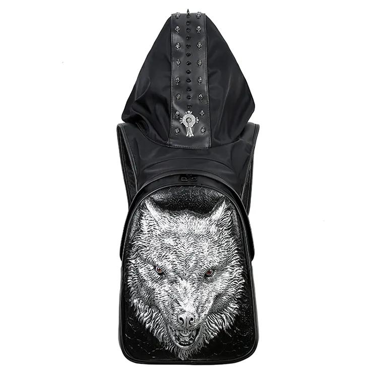 Backpack wolf black vegan leather 3D gothic hood silver unique emo