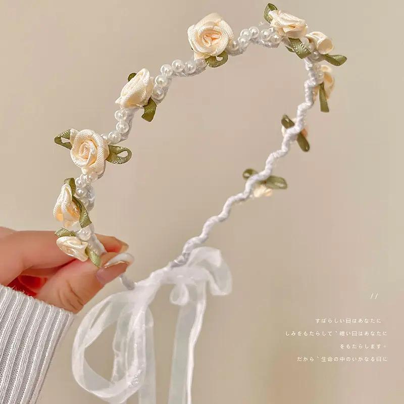 Midsummer wreath with pearls and flowers diadem silk ribbon