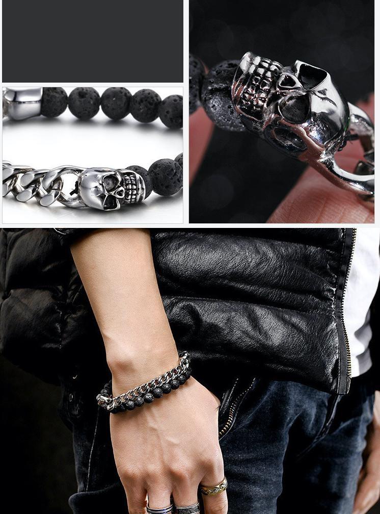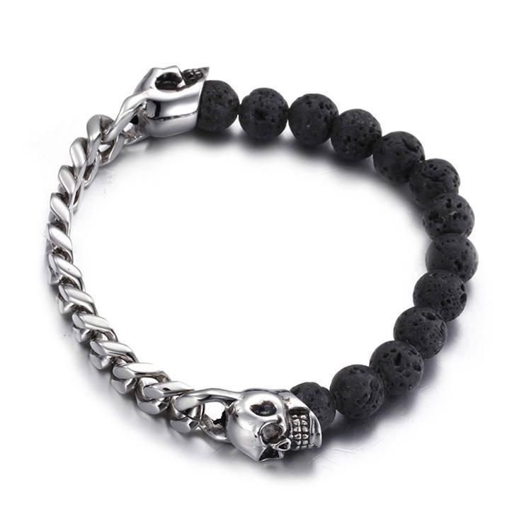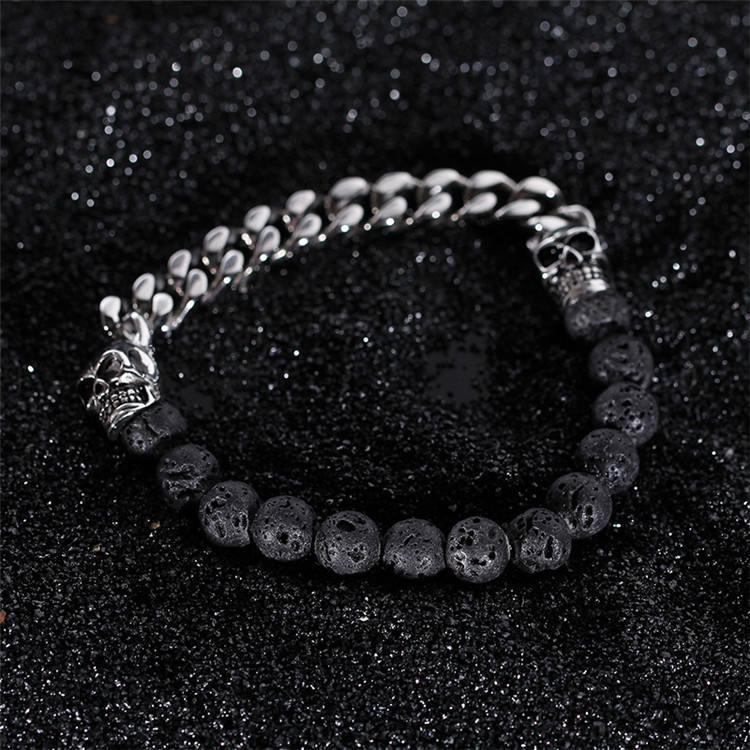 Armband i rostfritt stål kubansk länk döskalle vulkaniska stenar