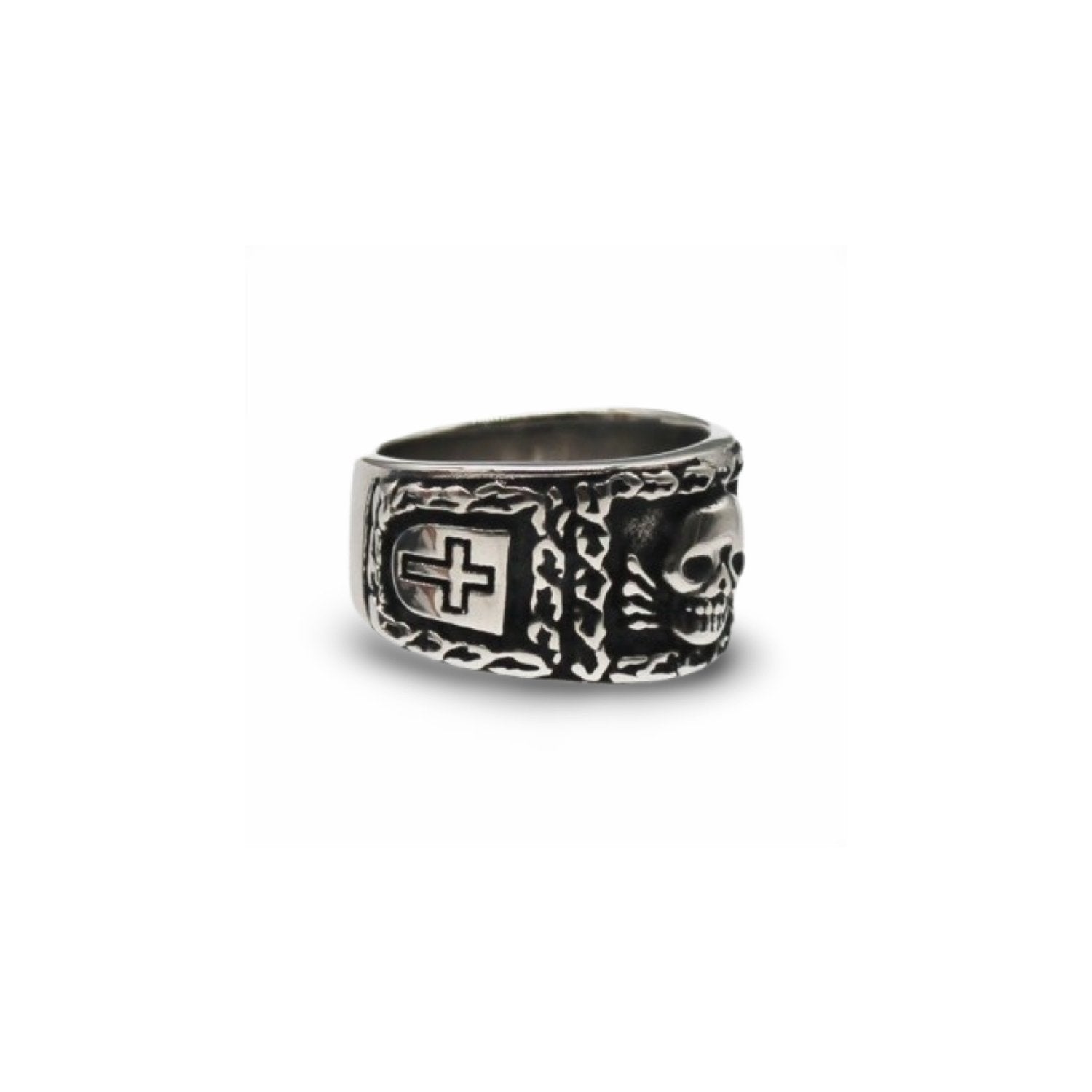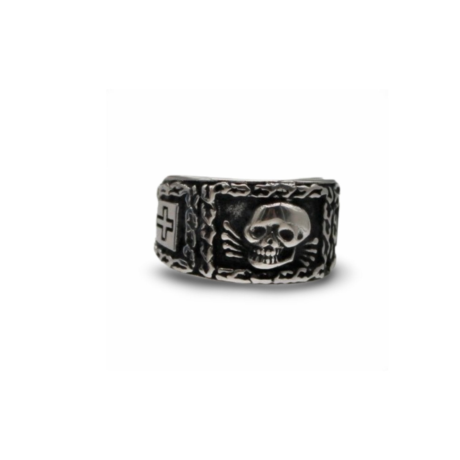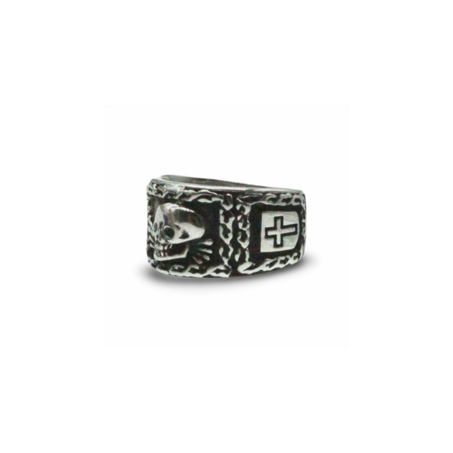 Dödskalle- och Kors Ring i Rostfritt Stål med Kedjedetaljer