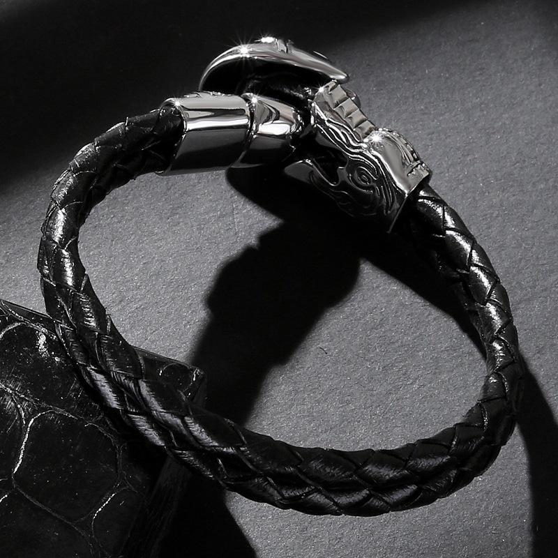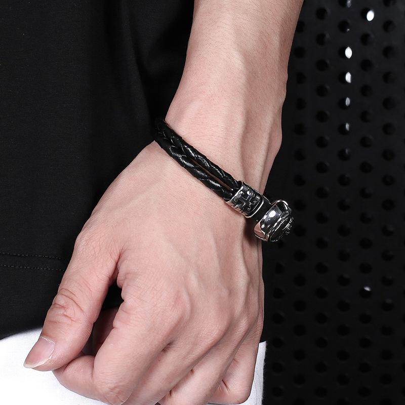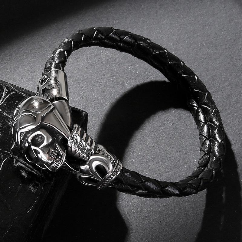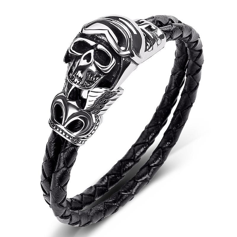 Handgjort flätat armband äkta läder med döskalle motorcykelhjälm