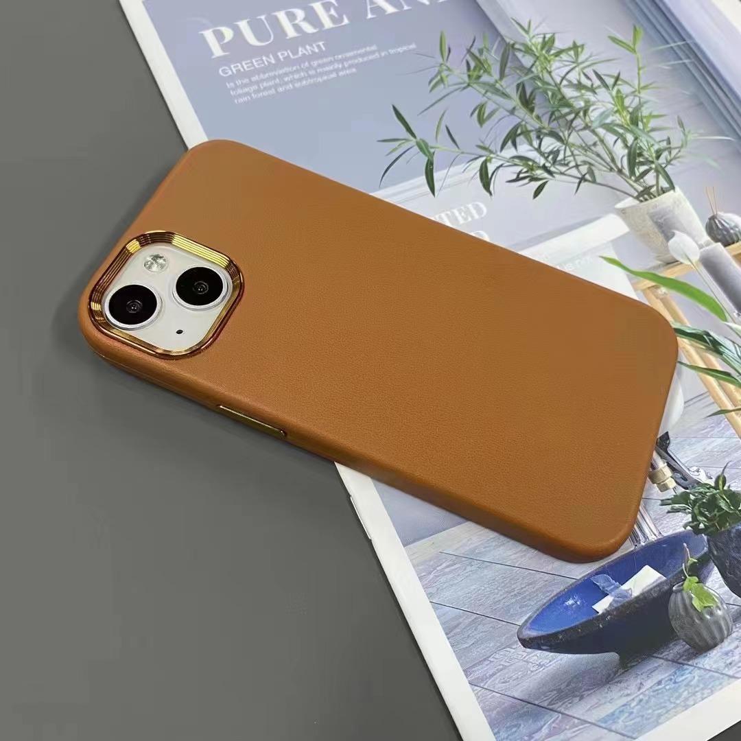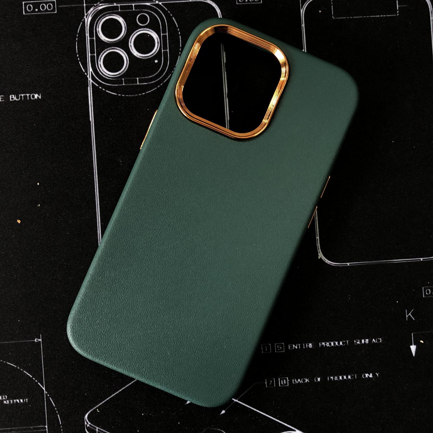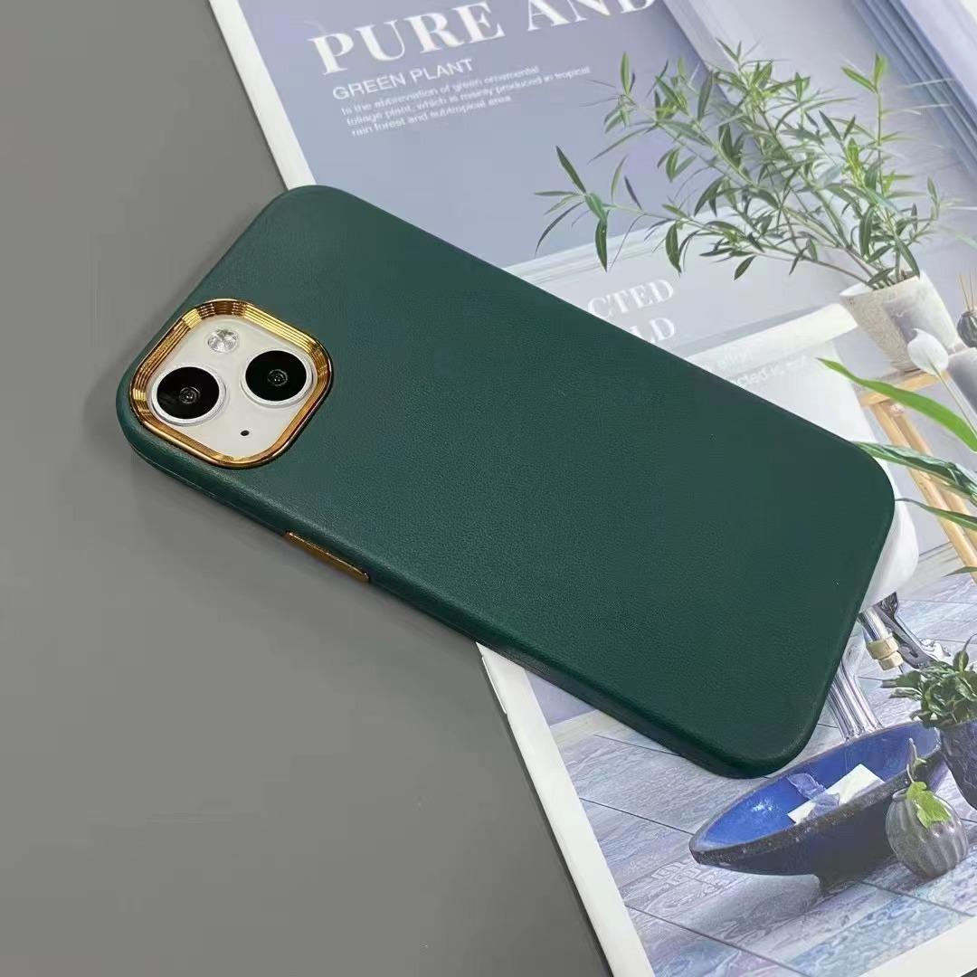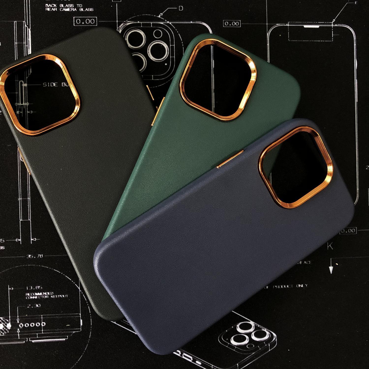 iPhone 13 klassiskt skal i veganskt läder guldram & guldknappar