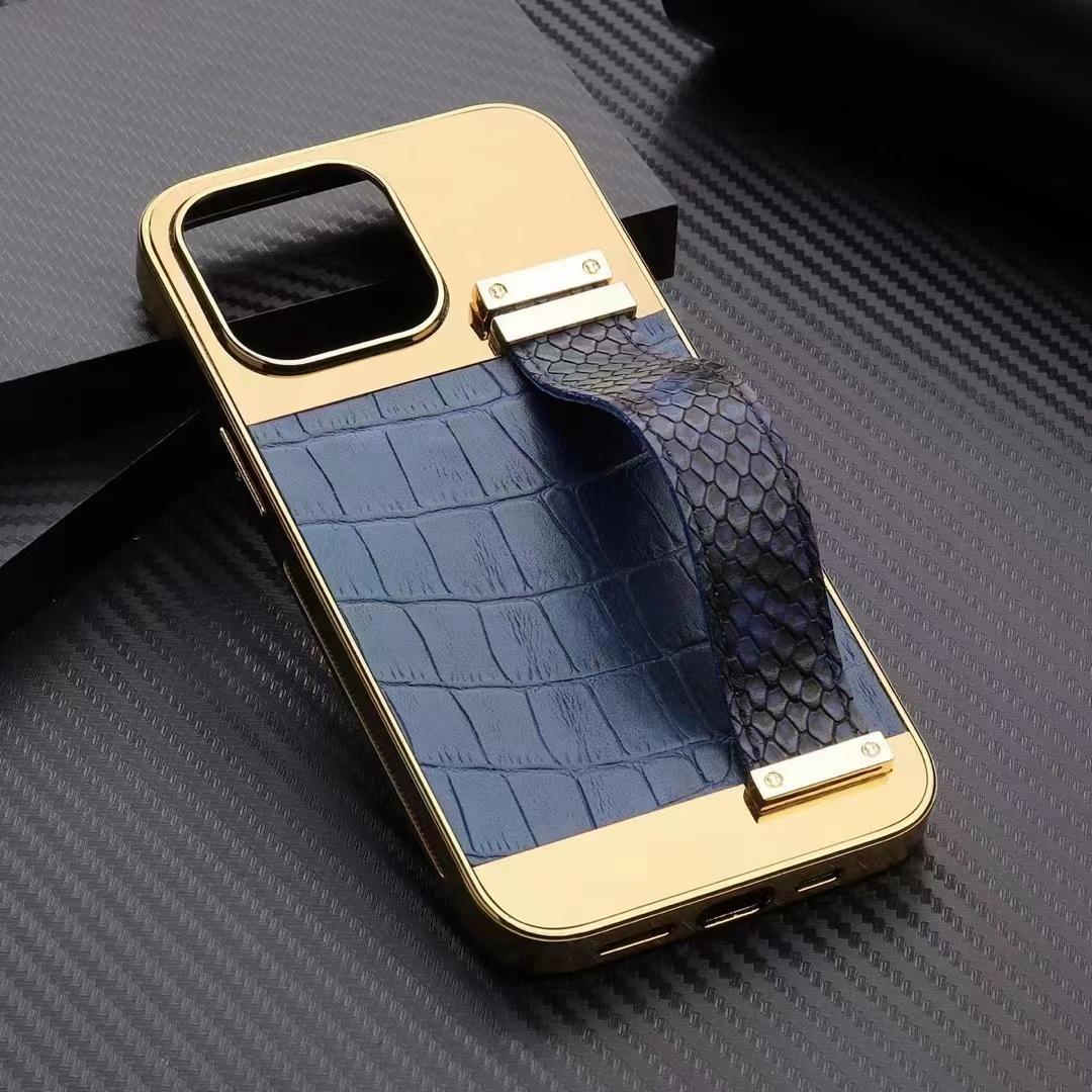 iPhone 13 skal veganskt läder med band för bra grepp guld