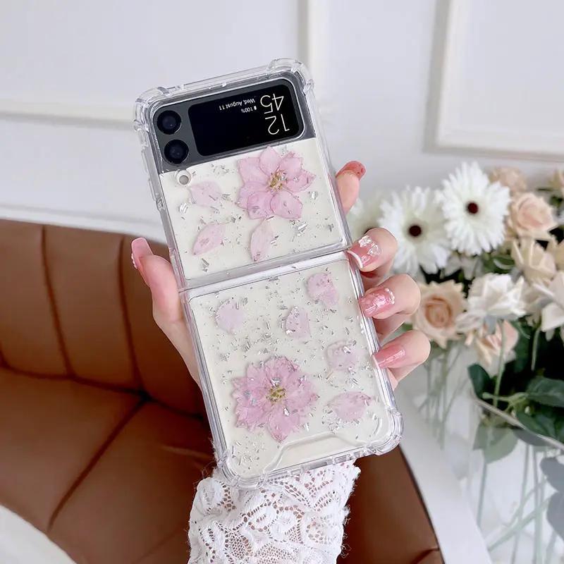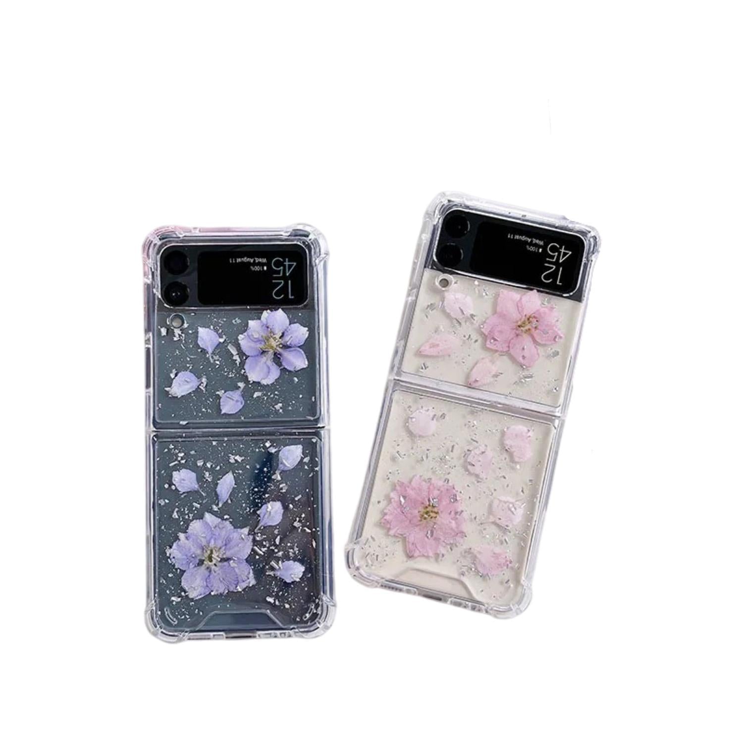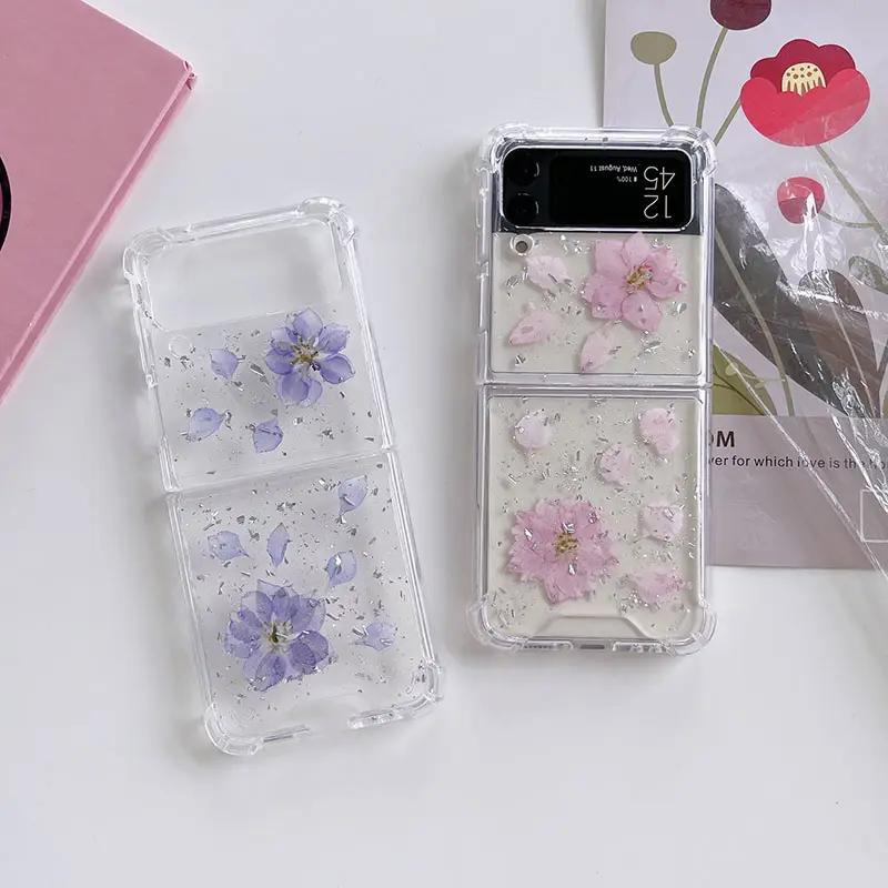 Samsung Galaxy Z FLIP 3 - transparent skal med torkade blommor och glitter