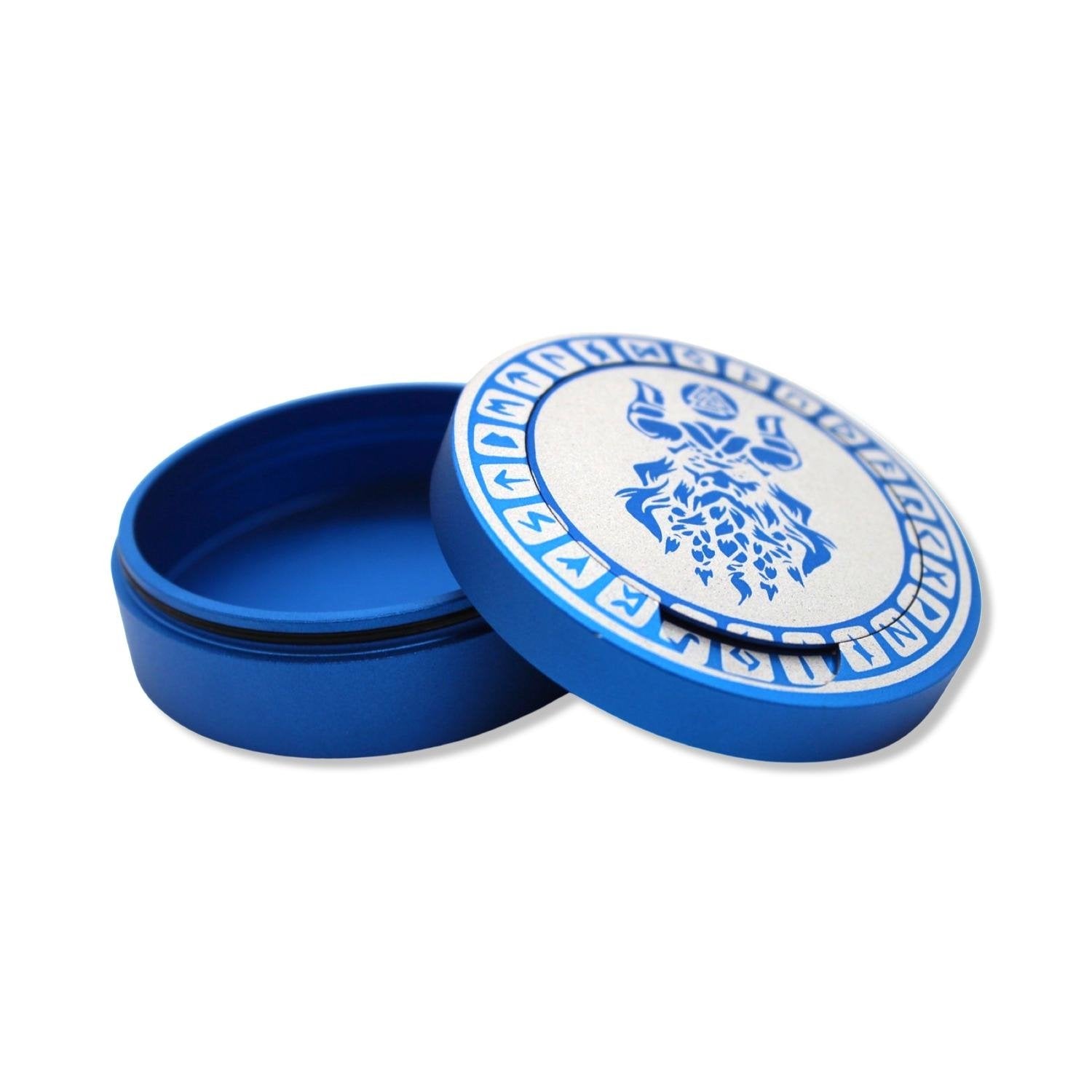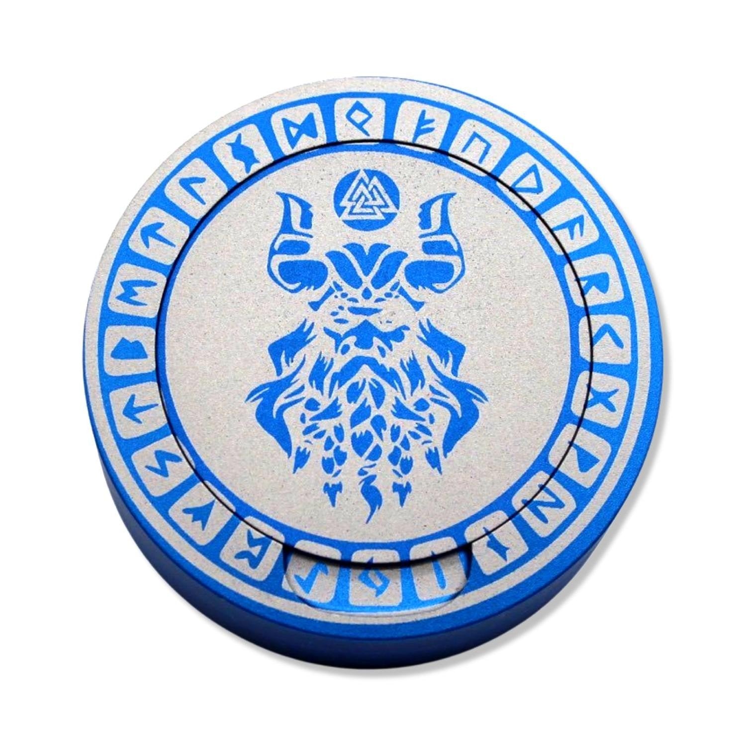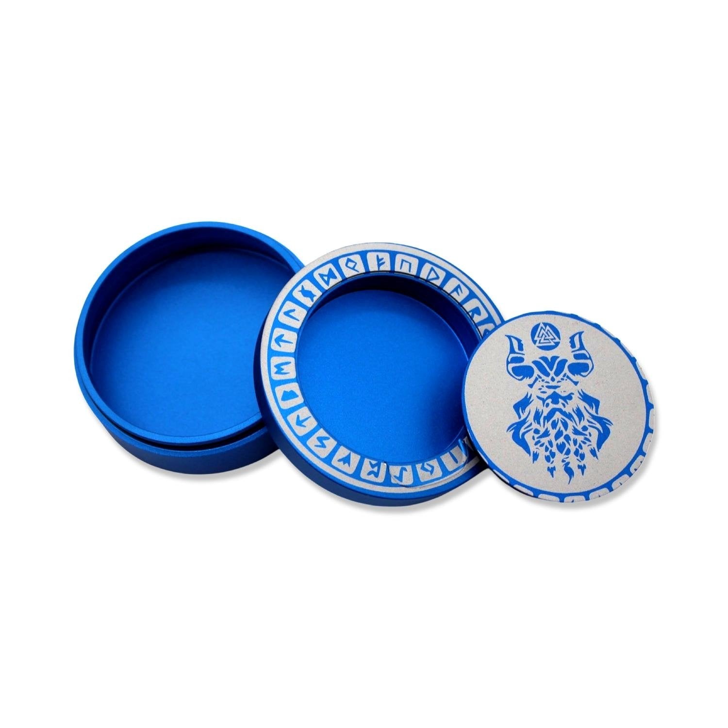 Snusdosa i blå aluminium för alla snus - Viking med runskrift valknut symbol