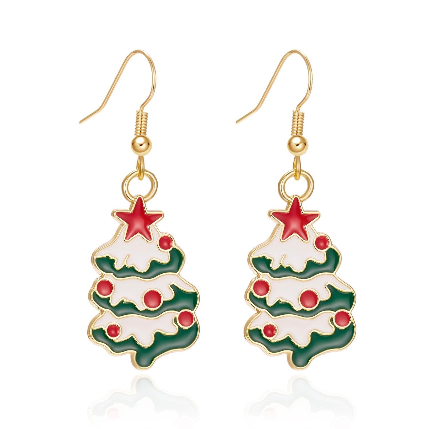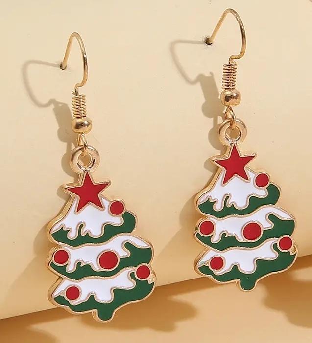 Snygga örhängen julgran med snö röda kulor och stjärnor