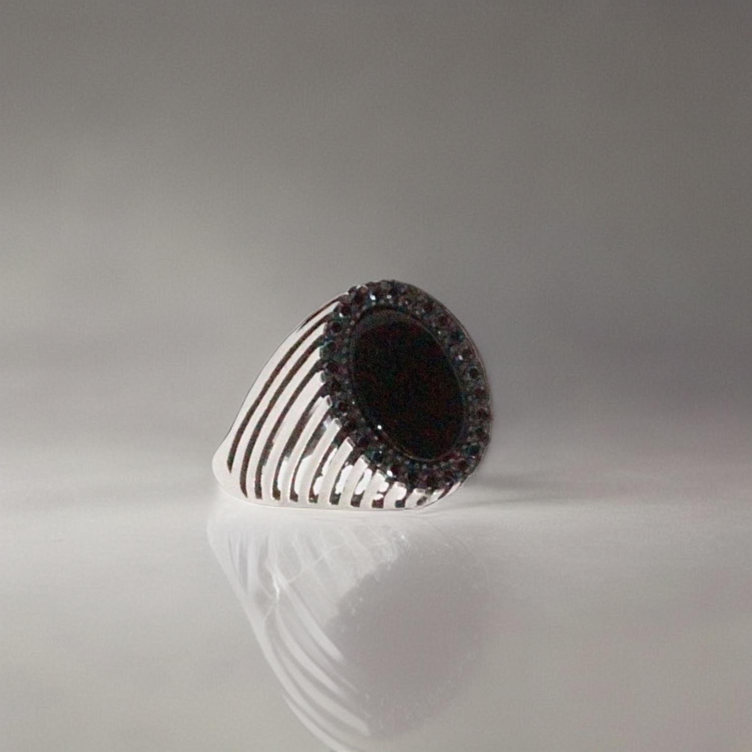 Sterling silver ring striped oriental pattern heel ring for men black round stone