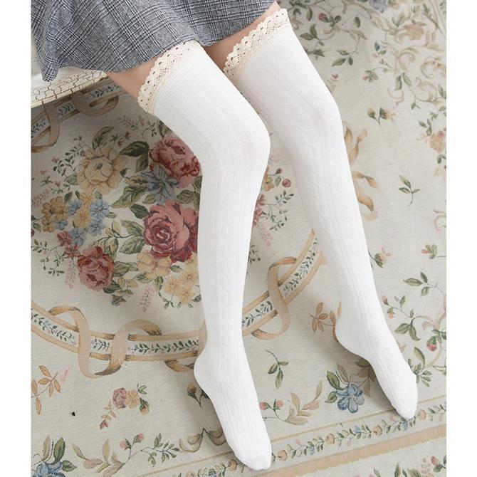 Stickade strumpor stay-ups elastiska med spets svart grå vit