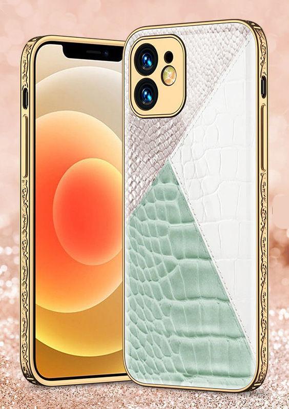 iPhone 12 Pro luxury glass shell pattern gold baroque leather blue white