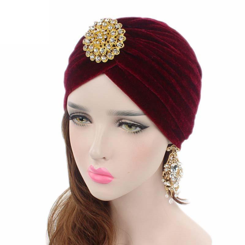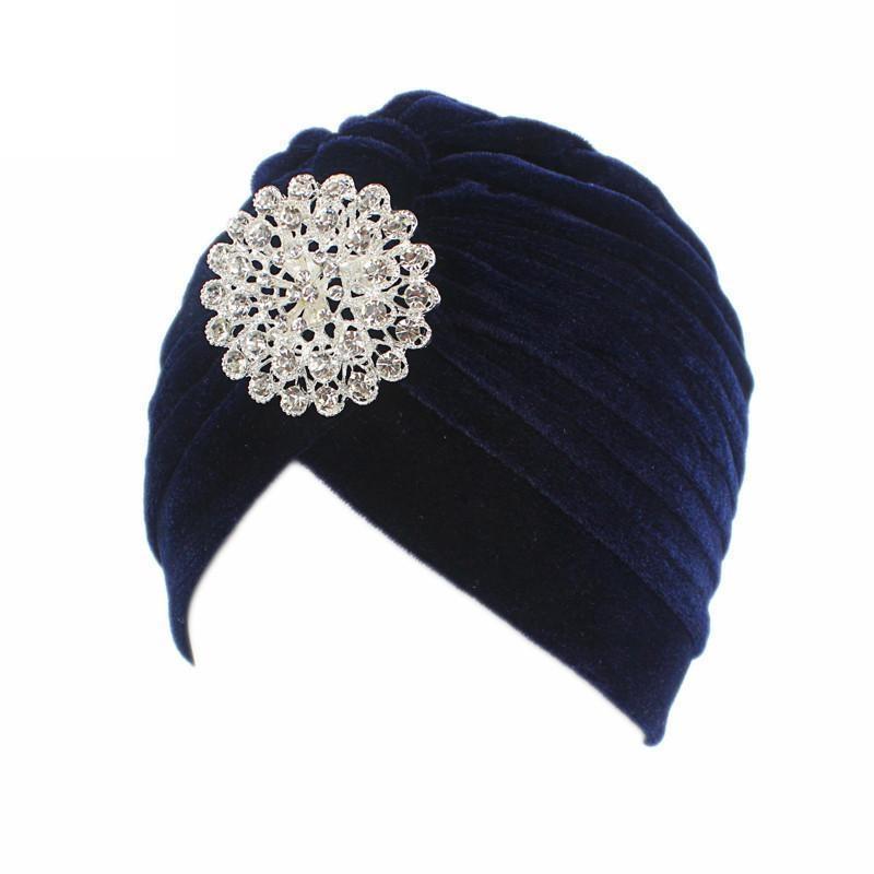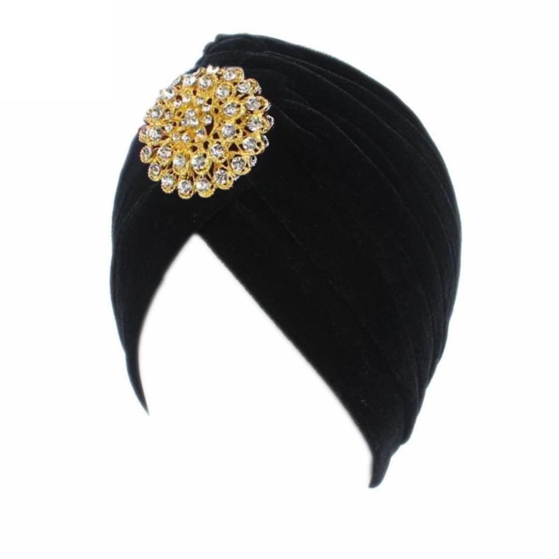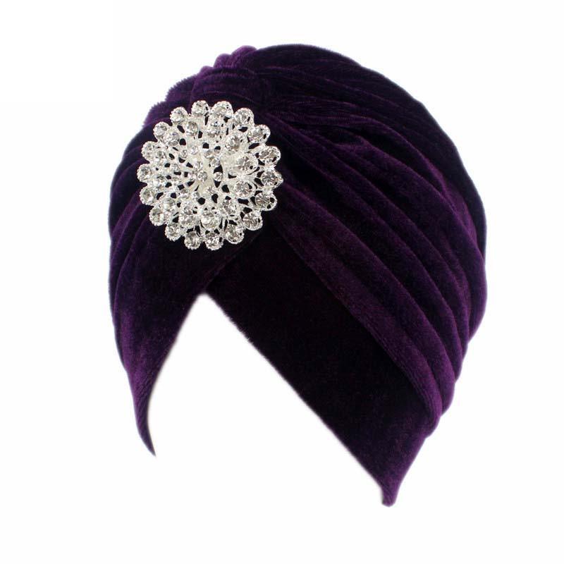 Lyxig turban i sammet och stor brosch diamanter strass mössa