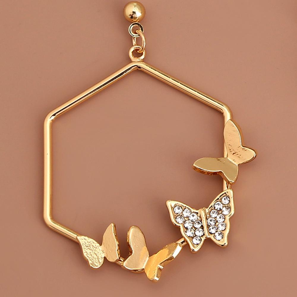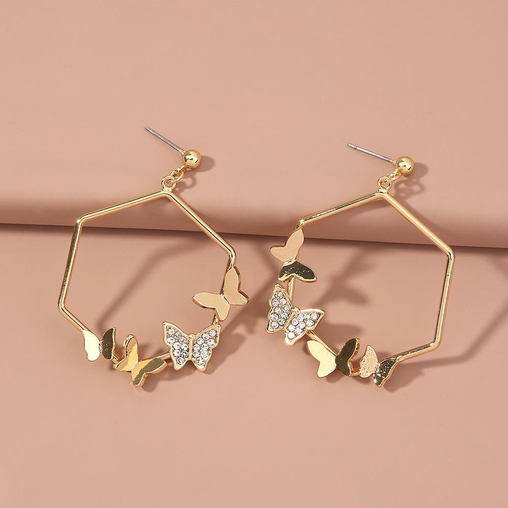 Geometric earrings in gold with butterflies and rhinestone hexagon